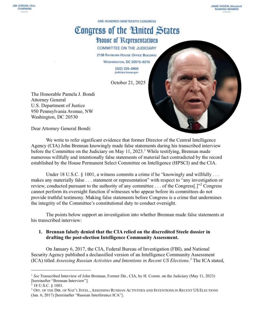 We write to refer significant evidence that former Director of the Central Intelligence Agency (CIA) John Brennan knowingly made false statements during his transcribed interview before the Committee on the Judiciary on May 11, 2023. While testifying, Brennan made numerous willfully and intentionally false statements of material fact contradicted by the record established by the House Permanent Select Committee on Intelligence (PSCI) and the CIA.