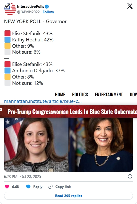 U.S. Rep. Elise Stefanik (R-NY) holds a slight lead over incumbent Governor Kathy Hochul, a Democrat, in next year’s New York gubernatorial race, according to a shock poll conducted by the Manhattan Institute.The poll found Stefanik — a staunch Trump ally who was initially nominated to serve as U.S. ambassador to the United Nations before the president asked her to remain in Congress — leading Hochul by one percentage point (43-42) among registered voters. An additional six percent of respondents indicated that they remain unsure, while nine percent of respondents said they would vote for a third party candidate.