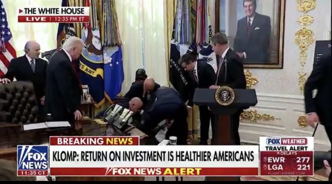 An unexpected medical emergency briefly interrupted a White House event today while President Donald Trump was delivering remarks on his administration’s initiative to lower prescription drug prices. According to reports from those in attendance, a man collapsed inside the Oval Office during the live appearance, prompting an immediate response from staff and Secret Service agents. The incident caused a short pause in the proceedings as medical personnel rushed to assist.