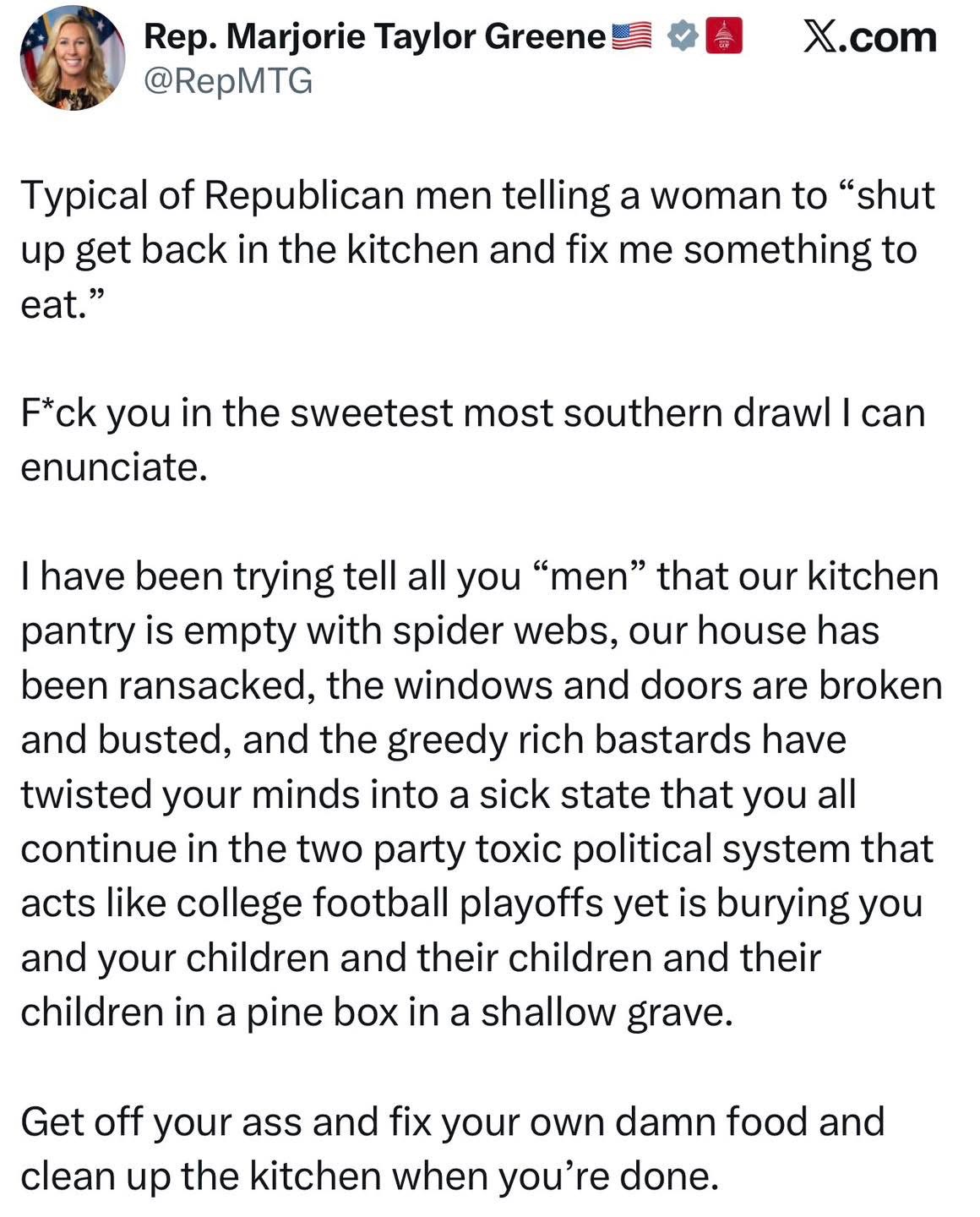 “Typical of Republican men telling a woman to ‘shut up, get back in the kitchen, and fix me something to eat.’Well, bless your heart — but absolutely not.